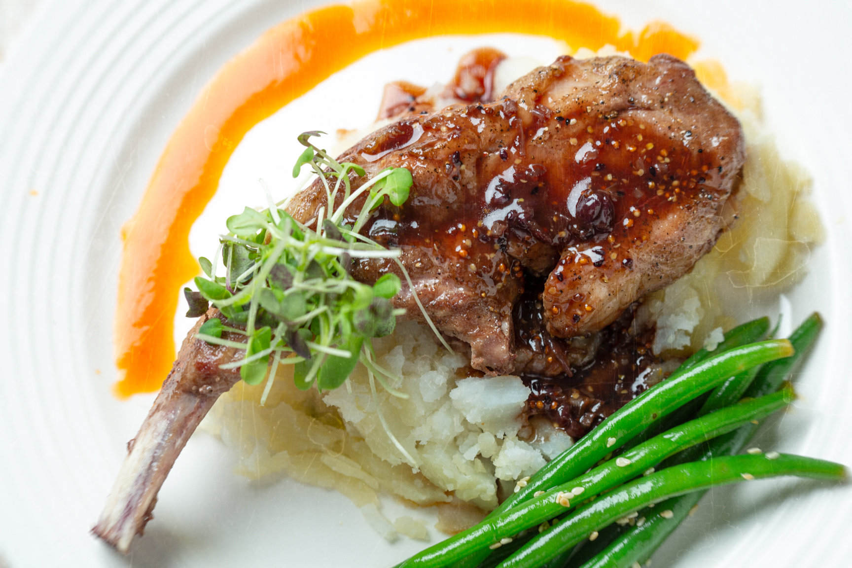 Iberico Pork Chop with a Black currant Demi Sauce Poached Herb Potato and Marinated Green Beans