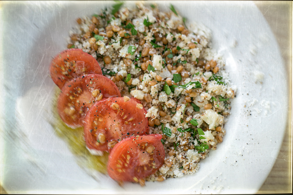To serve, place 3 tbsp of cauliflower into a shallow pasta bowl off to one side. Fan 1 tomato off to the other side. Drizzle tomato with olive oil, salt and pepper.