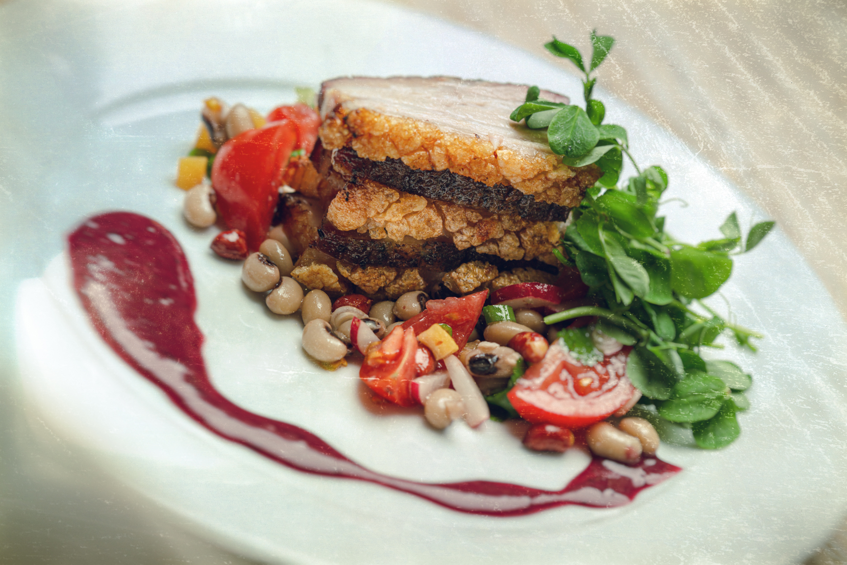 Cut the pork into ¼” slices widthwise. stack 4 pieces on top of each other alternating the pork skin face in opposite directions. Place onto a plate off to one side. Add a scoop full of the bean salsa beside the pork. Spoon some of the blueberry sauce, garnish and serve.